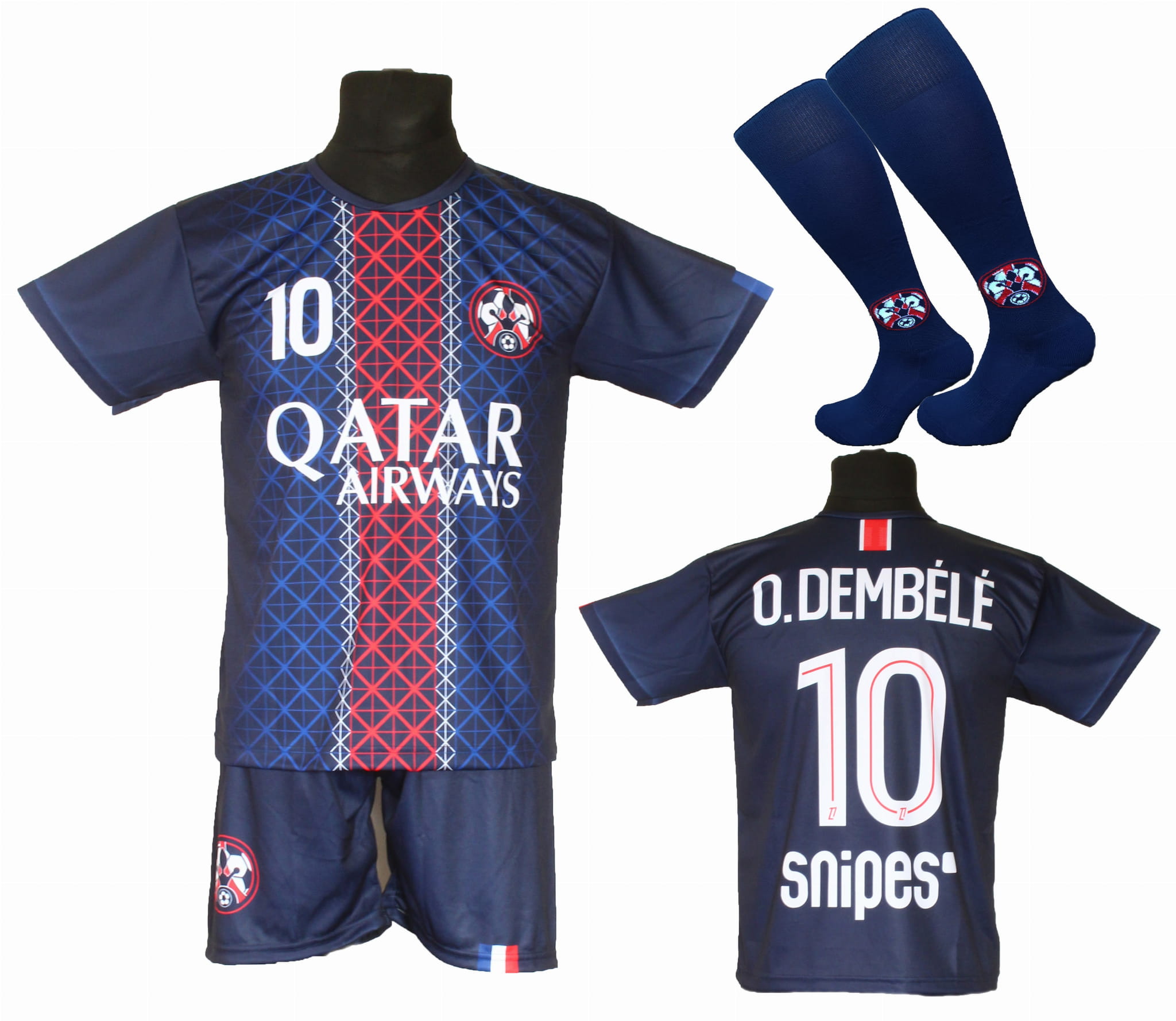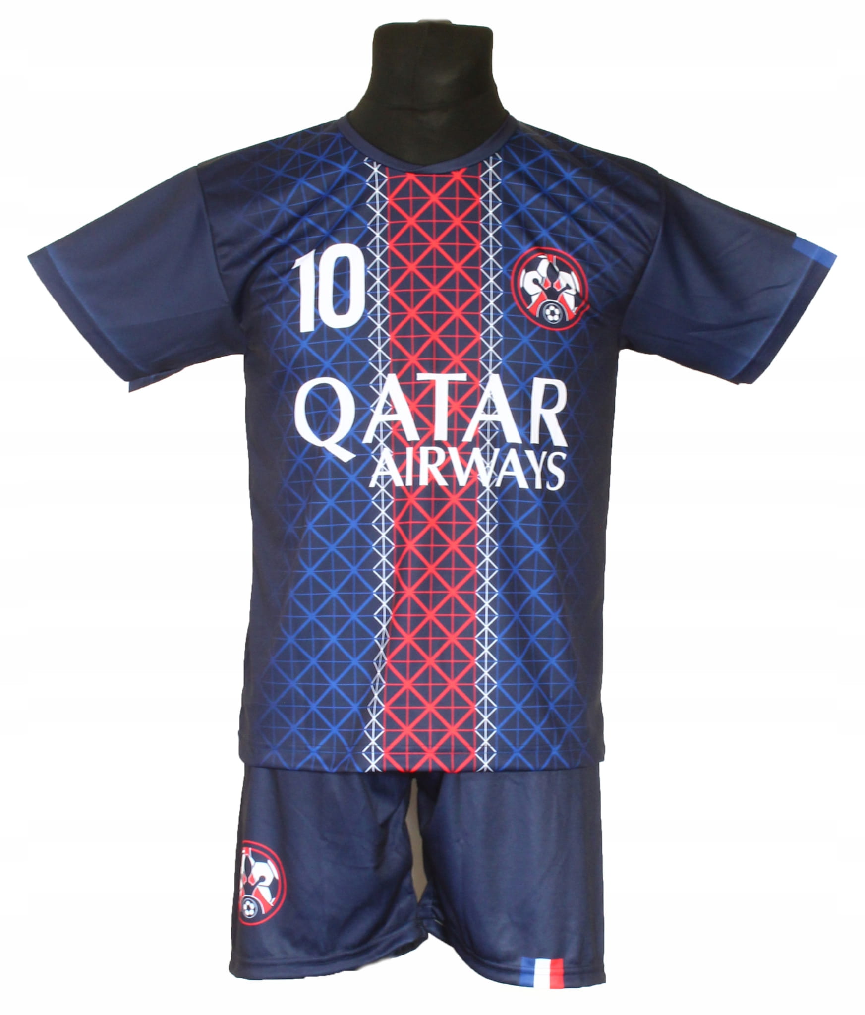 Przedstawiony na zdjęciu strój jest w kolorze granatowym i ma sportowy wzór inspirowany stylem piłkarskim. Produkt stanowi nieoficjalny komplet sportowy, przeznaczony do zabawy, treningów, zajęć sportowych oraz codziennego użytkowania.