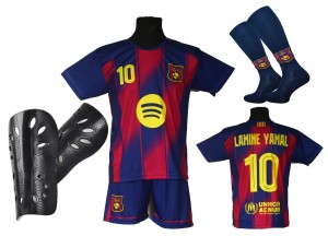 strój piłkarski dla dzieci Lamine Yamal bordowo-granatowy + ochraniacze