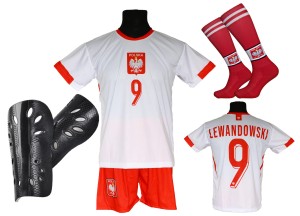 strój piłkarski dla dzieci Lewandowski Polska + ochraniacze