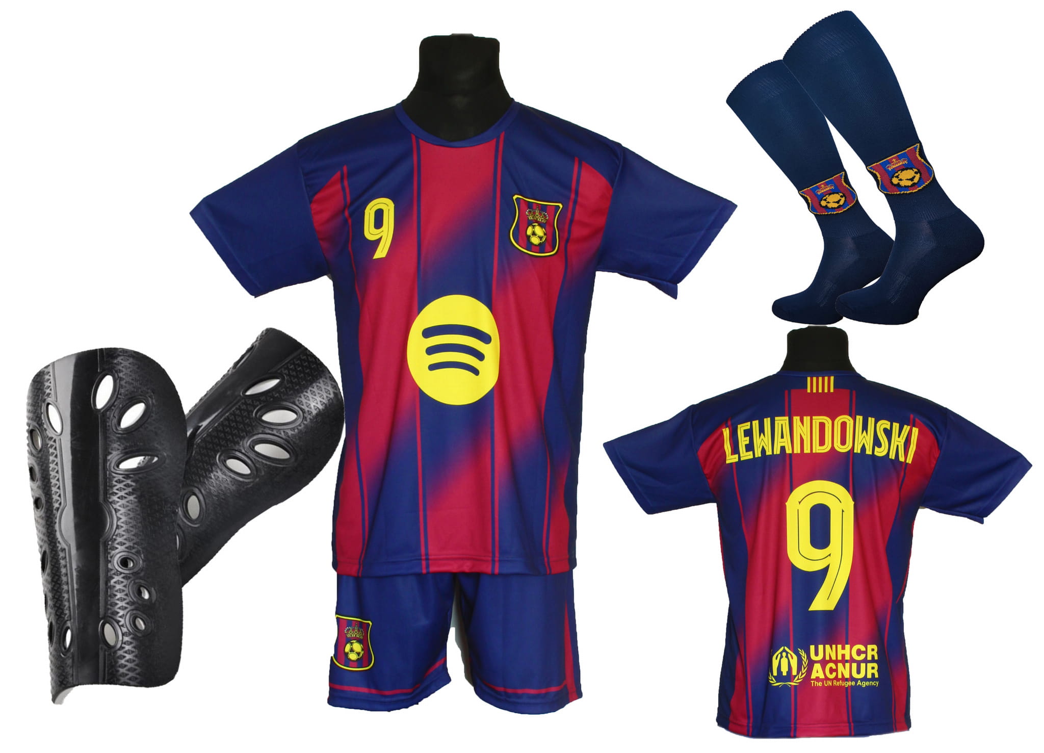 strój piłkarski dla dzieci Lewandowski bordowo-granatowy + ochraniacze
