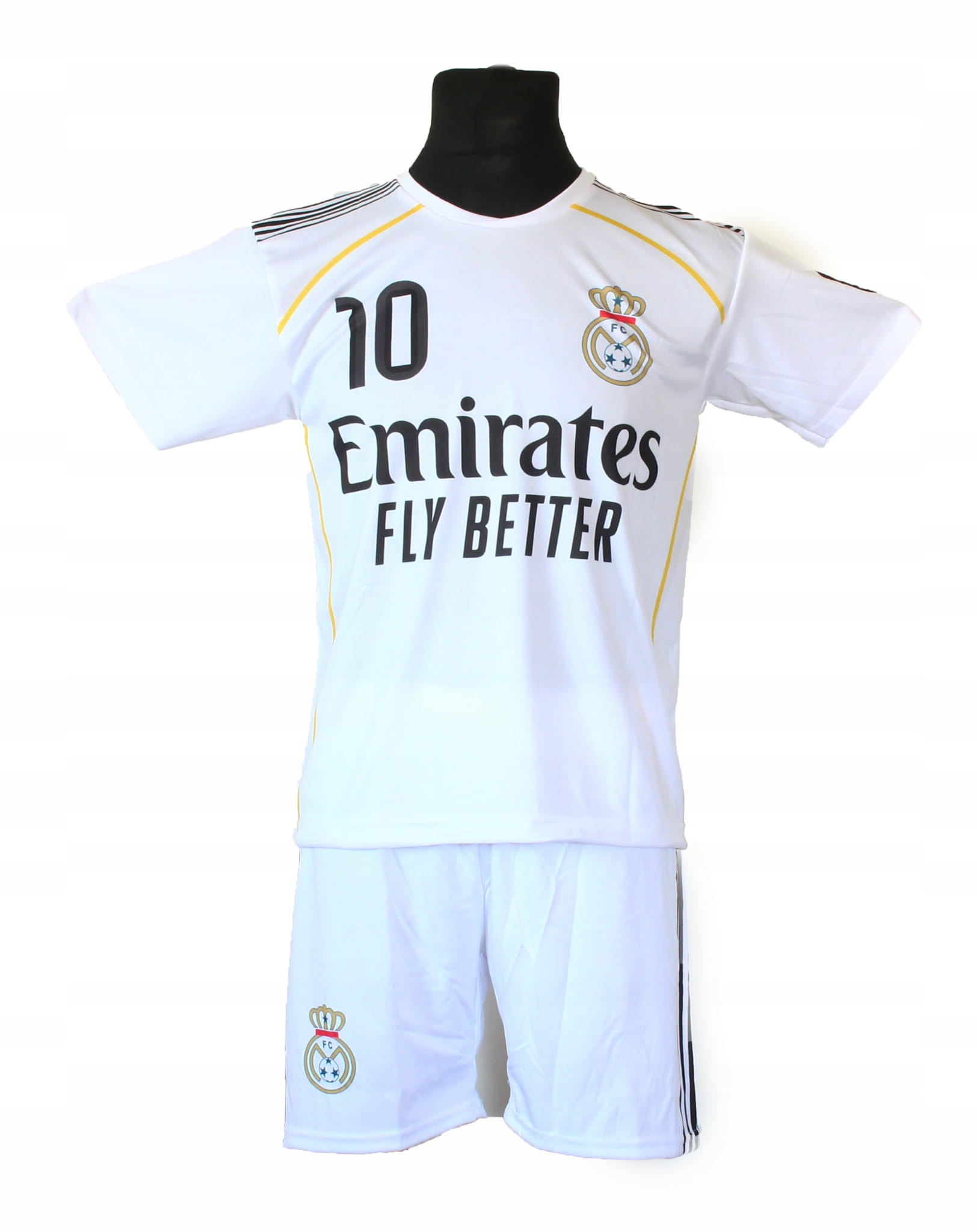 Przedstawiony na zdjęciu strój jest w kolorze białym i ma sportowy wzór inspirowany stylem piłkarskim. Produkt stanowi nieoficjalny komplet sportowy, przeznaczony do zabawy, treningów, zajęć sportowych oraz codziennego użytkowania.