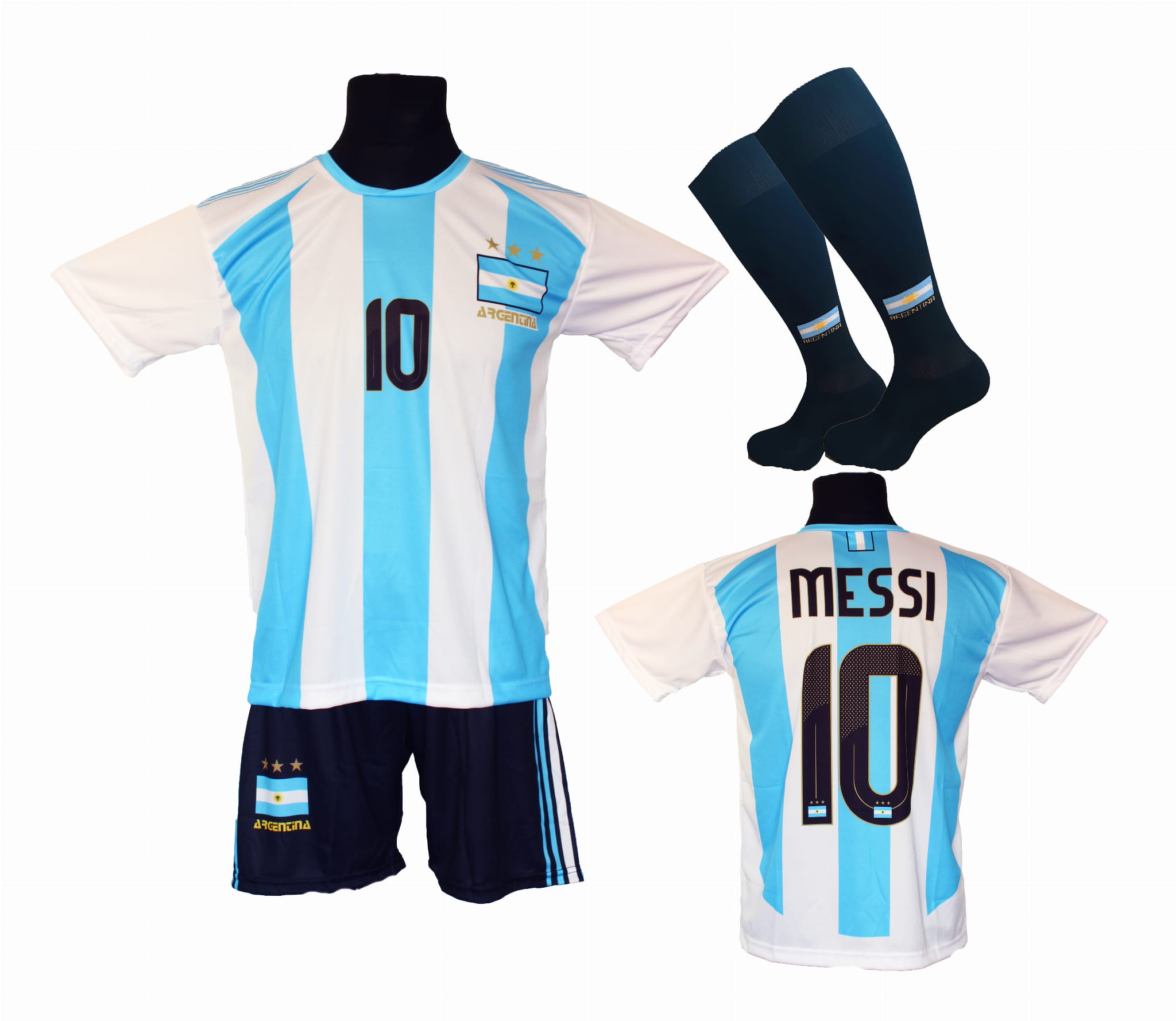 Przedstawiony na zdjęciu strój jest w kolorze biało-niebieskim i ma sportowy wzór inspirowany stylem piłkarskim. Produkt stanowi nieoficjalny komplet sportowy, przeznaczony do zabawy, treningów, zajęć sportowych oraz codziennego użytkowania.
