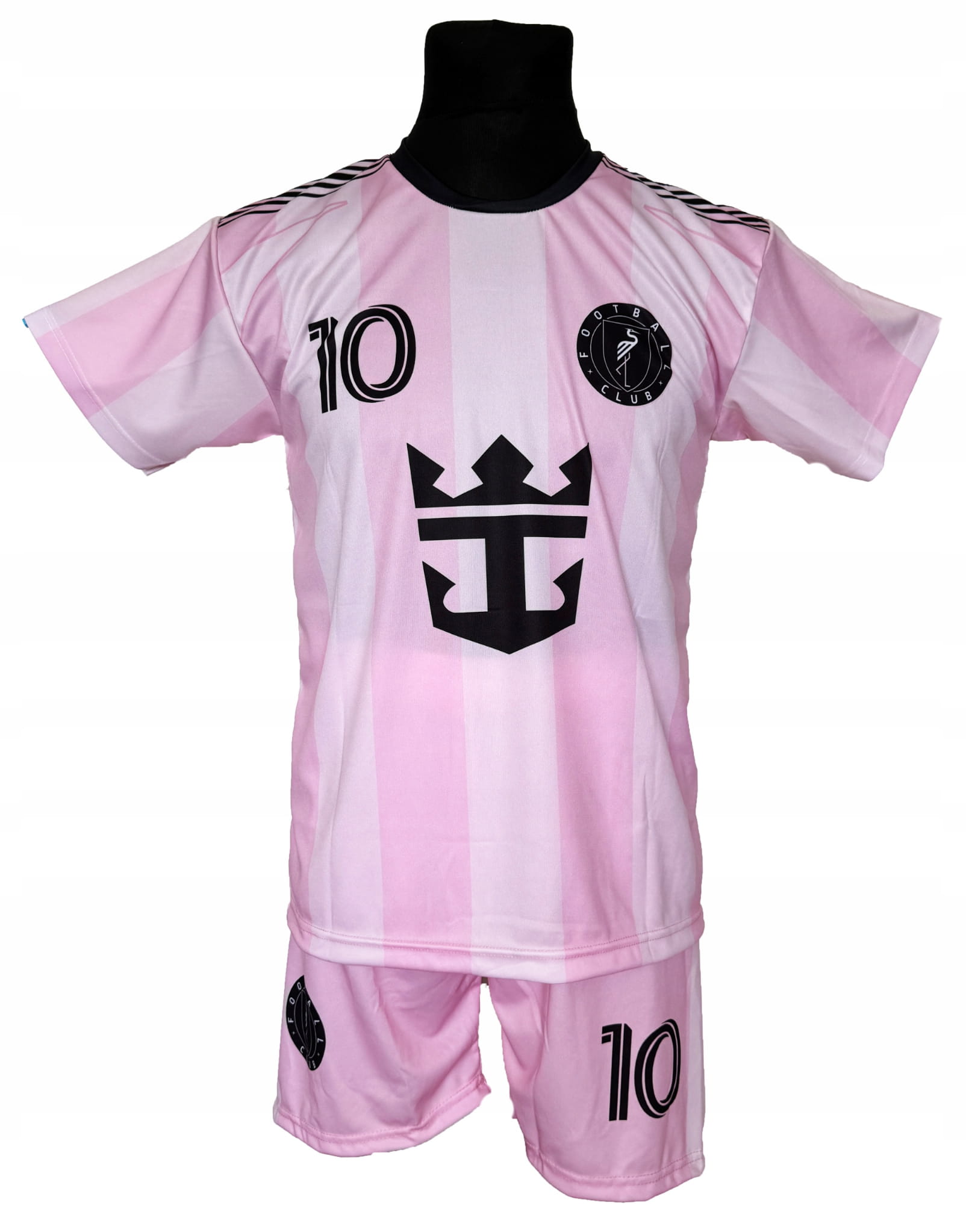 Przedstawiony na zdjęciu strój jest w kolorze różowym i ma sportowy wzór inspirowany stylem piłkarskim. Produkt stanowi nieoficjalny komplet sportowy, przeznaczony do zabawy, treningów, zajęć sportowych oraz codziennego użytkowania.