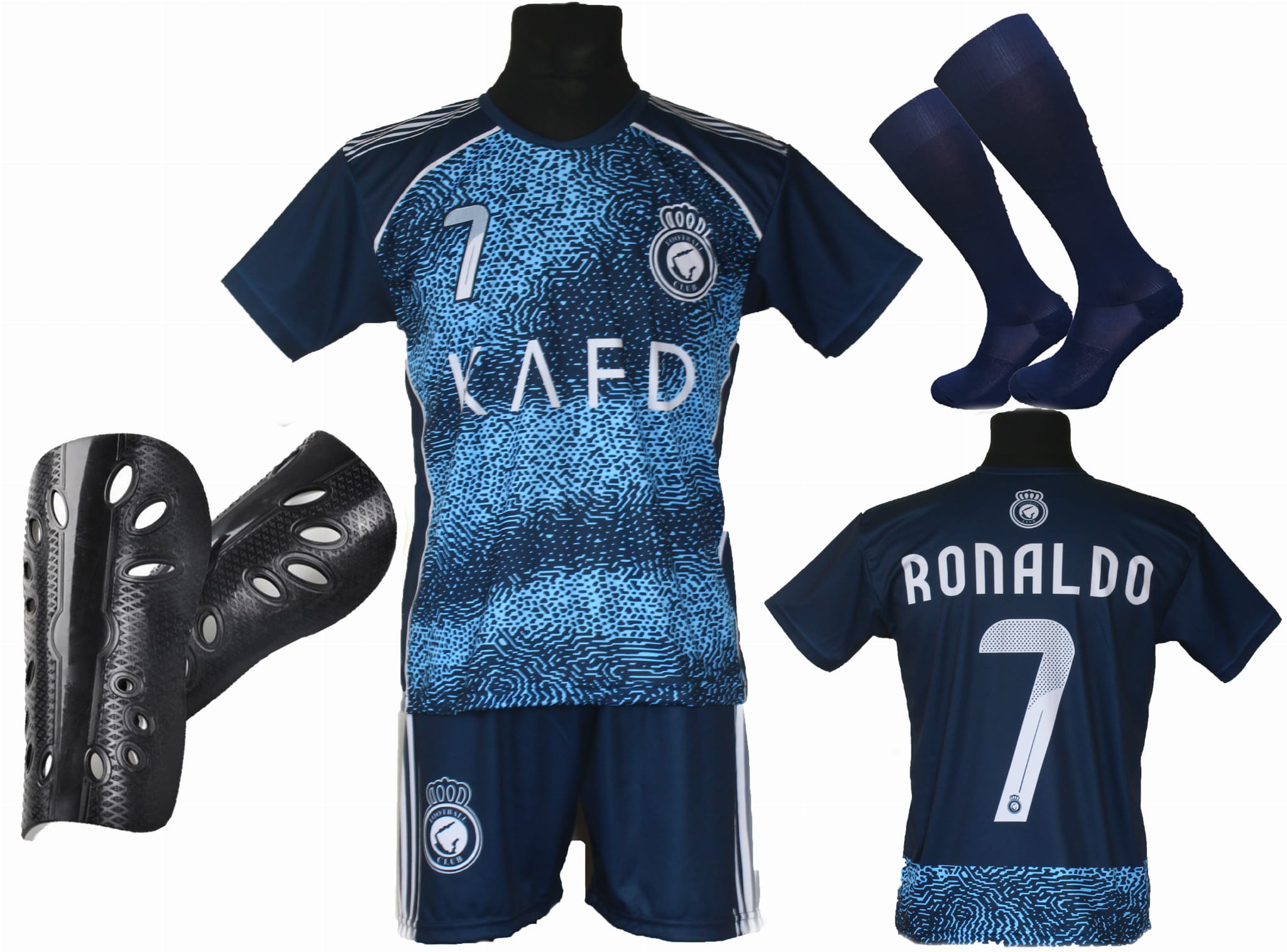 Granatowy strój piłkarski Ronaldo dla dzieci z ochraniaczami to wygodny, funkcjonalny i atrakcyjny komplet dla młodego zawodnika. Świetnie sprawdzi się jako komplet piłkarski dla dzieci na prezent i jako strój sportowy dla dziecka do gry w piłkę.