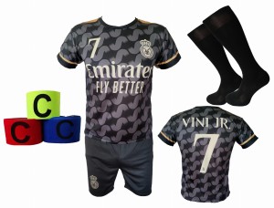 Przedstawiony na zdjęciu strój jest w kolorze czarnym i ma sportowy wzór inspirowany stylem piłkarskim. Produkt stanowi nieoficjalny komplet sportowy, przeznaczony do zabawy, treningów, zajęć sportowych oraz codziennego użytkowania.